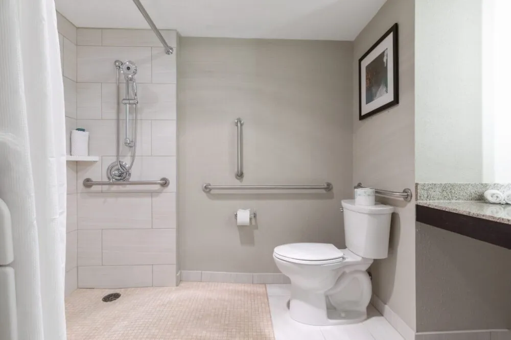 This mobility and hearing accessible standard room features one queen-sized bed and a roll-in shower. The room also has a visual alarm and notification devices for the doorbell or door knock and incoming telephone calls. Free WiFi, 32-inch HDTV, alarm clock as well as hairdryer, iron, beverage chiller and coffeemaker. Any corresponding photo may not reflect the specific accessible room type or room feature.